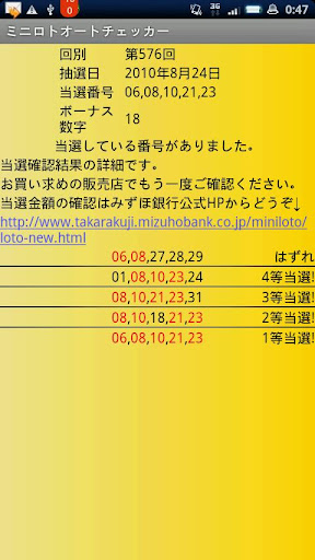 ▼アプリに番号を登録しておけば当選確認を自動で行うことができます(最新の抽選結果のみが対象です)。