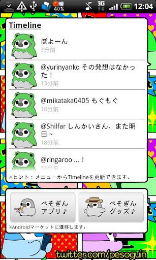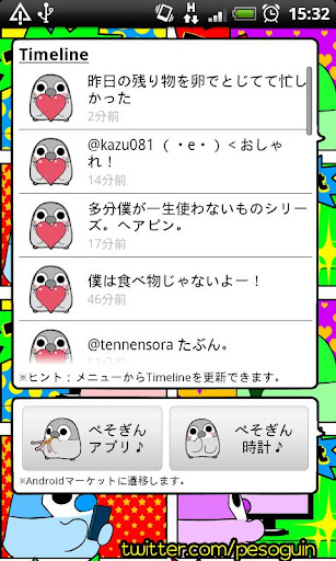 人気キャラクター「ぺそぎん」(Pesoguin)が気ままに呟くウィジェット(Widget)です。