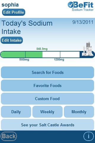 Download and start tracking today. Monitoring/lowering sodium levels can significantly lower your risk for cardiovascular disease. This app allows you to set preferred daily sodium intake levels. Enter what you eat from your Android device. BeFit offers an intensive food list, populated by the U.S.D.A. and major chain restaurants nationwide. The app also allows you to enter personalized food items and tag your favorites. Track and trend your results and have graphs of your weekly/monthly/yearly progress emailed. Meeting your daily goals also unlocks cool, special Salt Castle badges that you can store in your profile.