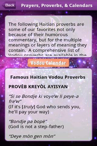 Learn all about famous Haitian Vodou proverbs, prayers and ritual holidays with our exclusive Vodou calendar. The Erzulie’s Voodoo “Advanced” app also arrives with its very own searchable Vodou glossary and resource section.