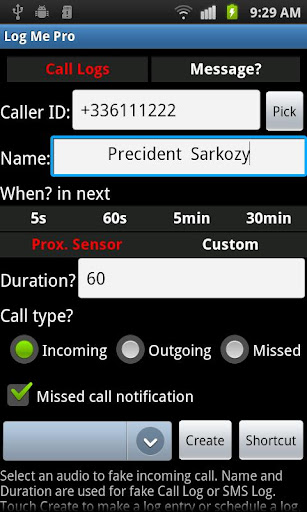- Fake incoming call, sms, outgoing call/sms, missed call