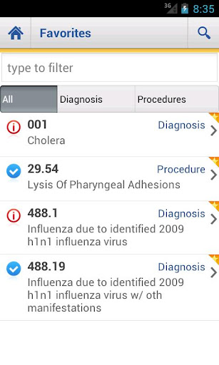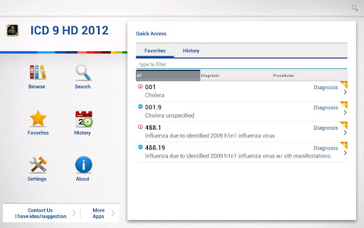 The 2012 ICD9-CM diagnosis codes are instantly searchable and also browsable by their traditional categories. Search by code or diagnosis, through the whole ICD9-CM or through just a category or selected nonspecific code. Images within the list indicate whether a code is specific or nonspecific. Tap to view the diagnosis and the full text of its standard ICD-9 long description and to add it to your Favorites list for immediate access later.