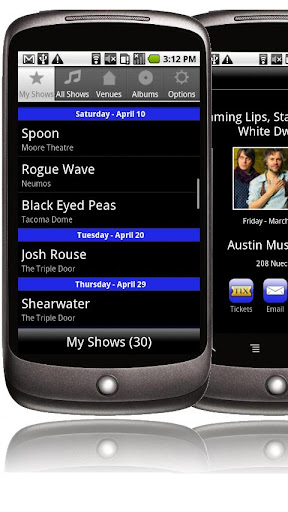 Pulls the artists from your phone or home computer and displays upcoming concerts and album releases.