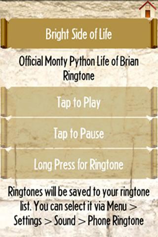 Enjoy this classic Monty Python's Life of Brian clip again and again. The app includes two ringtones, Bright Side Of Life and The Brain Song and nine Romanesque wallpapers. Download more clips, ringtones and wallpapers in our other Monty Python apps. Collect them all!