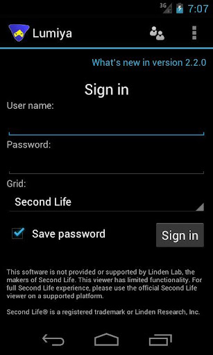 Lumiya is a Second Life and OpenSim client with 3D world view. With Lumiya, you can send and receive instant messages, teleport to your favorite Second Life locations, participate in local chat, interact with objects, manage your inventory, and even see the virtual world around you in 3D.