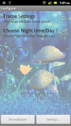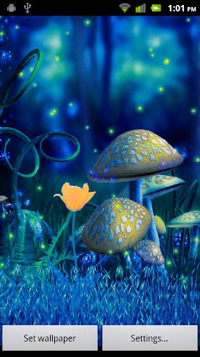 Magic Mushroom Land Live Wallpaper features a nice Hi-Def image of nice vibrant colorful mushrooms with fully animated grass, a nice beautiful fully animated flower and some magic dust particles on the screen. There is also Day Time and Night Time Settings.