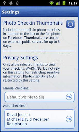* Privacy settings allow you to compose lists of selected friends to which your checkins should be visible. There are separate lists for manual and auto-checkins.