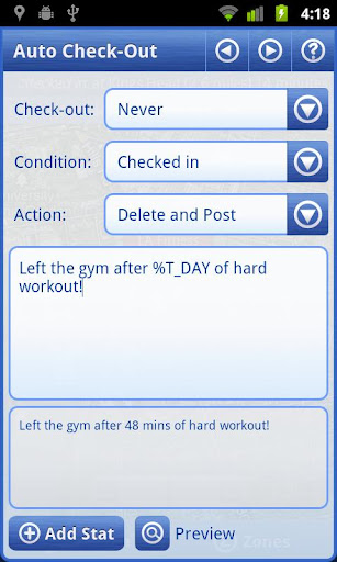 * Automatic check-outs which delete a check-in and/or post a wall message when leaving a zone. Why stay checked-in when you have left a place?