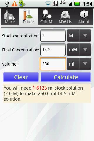 “Solution Calculator Pro” is a convenient calculator for making chemical solutions and for diluting solutions using a stock solution. It helps you to quickly determine how much chemical/stock solution you need. It is useful for students taking chemistry classes, or researchers working in a biology, chemistry or biochemistry laboratory. You do not need to mess around with your calculator and can spend more time in your study or research.