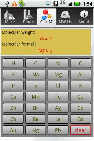 Solution Calculator also contains a handy tool to calculate molecular weight (M.W.) of commonly used chemicals in the lab. You do not need to enter the name or molecular formula of the chemical, you just need to press a few buttons to get the MW of the chemical instantaneously. Please visit the developer’s page: http://www.cooloy.com for details.