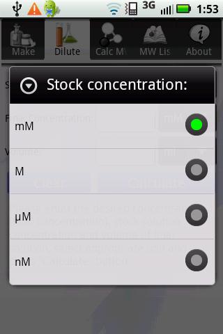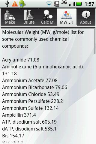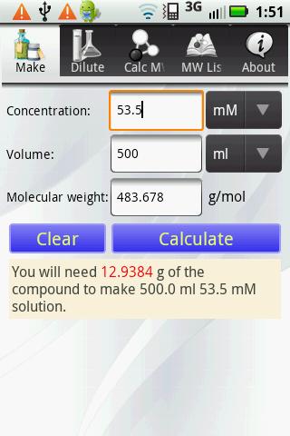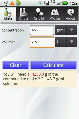 Keywords: biological, biochemical, scientific, laboratory, lab, weight, calculator, concentration, molar, g/mole, liter, android