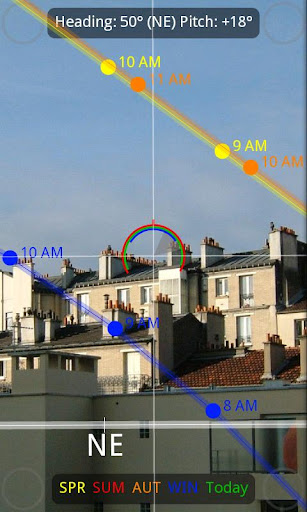 SunPlan™ overlays Sun paths for the Spring Equinox, Summer Solstice, Autumn/Fall Equinox, Winter Solstice and 'today' onto a live stream from your camera. 'Follow' the sun path by panning your camera around. Photos, complete with overlay and location information, can be captured for later reference.