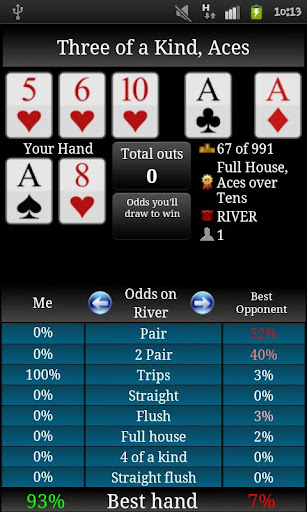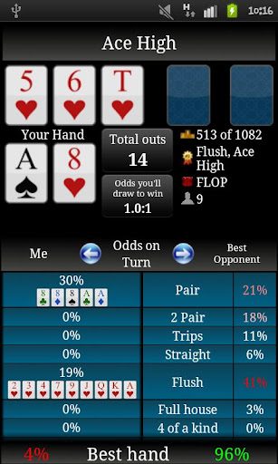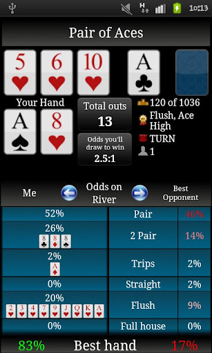 -Calculates the winning percentage of your hand at the Flop,the Turn or at the River