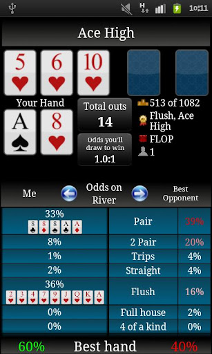 It will directly show the outs to improve your hand and calculates the odds of drawing to win at the river.