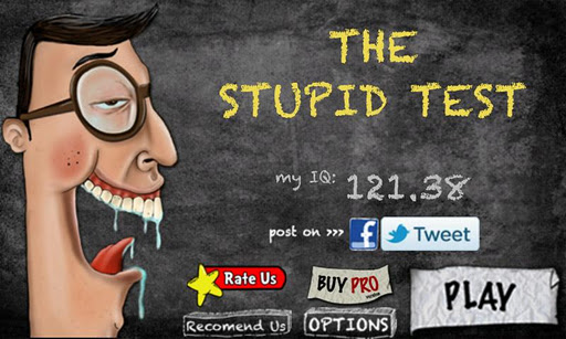 Sind Sie ein kompletter Trottel oder ein echtes Genie? Wenn Sie oft diese Frage schon nachgedacht, darüber nachzudenken nicht mehr - nur bekommen The Stupid Test für Android. Schon bald werden Sie beantworten Fragen verrückt - Vorsicht, viele sind auf Reise, die Sie auf neu entworfen! Kannst du herausfinden, die manchmal schräge Antworten (und wissen Sie, was schräg ist)? Wenn Sie Puzzle kann diese mind-Bieger, erhalten Sie eine hohe IQ und beeindrucken Sie Ihre Freunde. Features: - 35 Spaß, süchtig Stadien - Post Ihren höchsten IQ-Werte auf Facebook und Twitter - Checkpoints in den einzelnen Abschnitten des Quiz - Beautiful Hand gezeichnete Grafik - Vergleichen und testen Sie es mit Ihren Freunden! Spaß für alle Altersgruppen