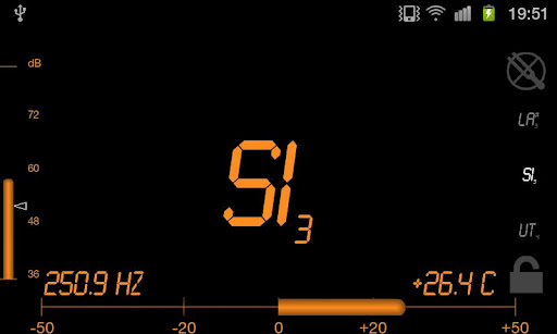 DaTuner's display is easy to read; nearest note and octave is displayed in a giant, easy to read font in the center of the screen, and frequency in hertz plus error in cents is displayed at the bottom of the screen. Sensitivity is auto-adjusted, but can also be adjusted by touch via a bar on the left-hand side of the screen, and the speed/accuracy of the algorithm and the relative frequency (if other than 440Hz) can be adjusted via the configuration menu.