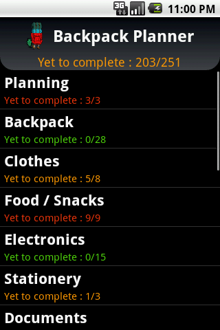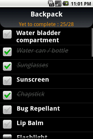 Configurable backpacking planner with everything needed for backpacking trips. Comes pre-populated with more than 250 backpack items. If you are a backpacker, this is all you need to ensure you don't forget anything. Check/uncheck and reuse everytime you go on backpacking trips. Save all the time typing the backpack list. Easy and very intuitive thumb friendly check/uncheck options.